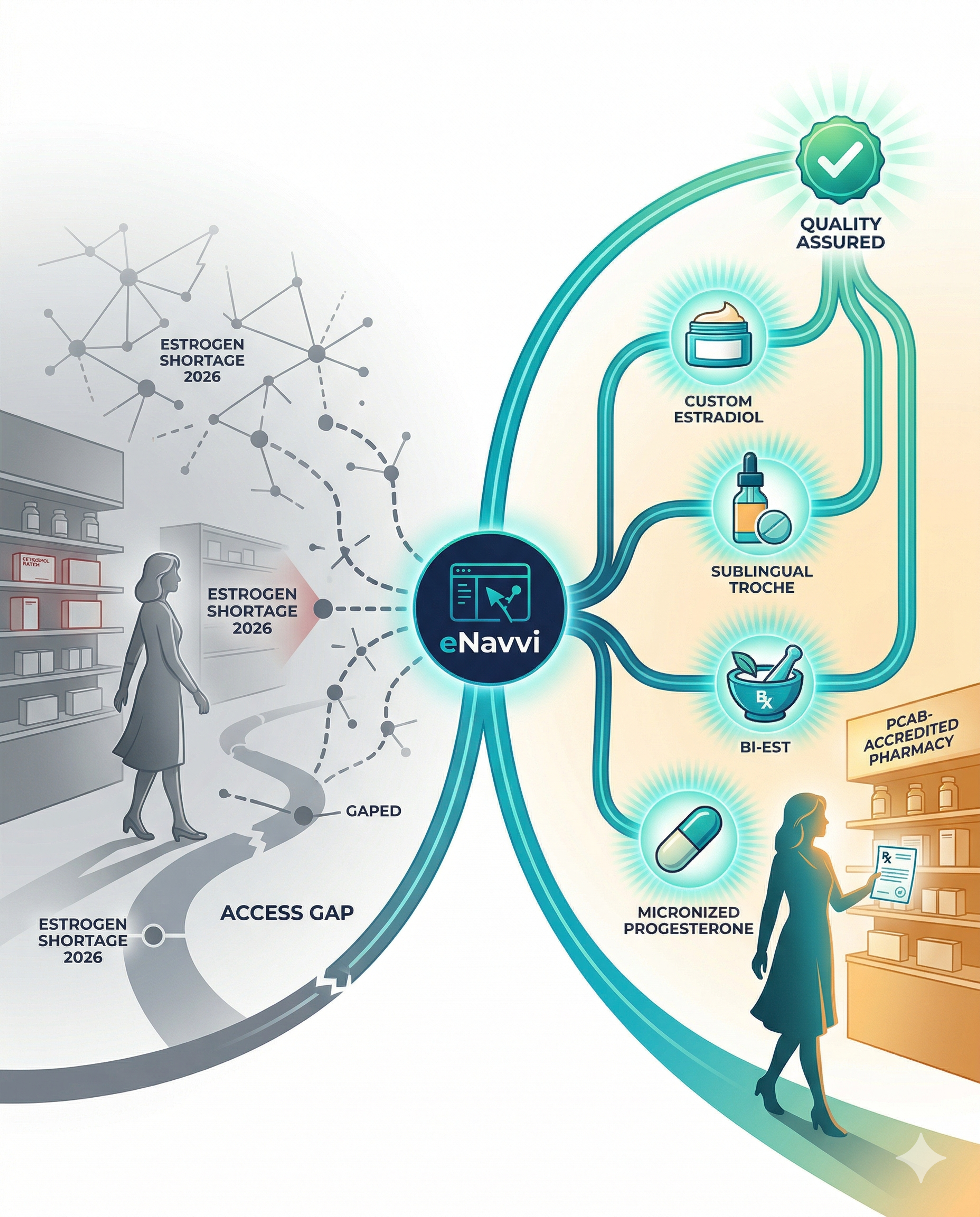 Establish your compounding partner before you need one. The worst time to vet a compounding pharmacy is when your patient is mid-shortage and needs a prescription filled tomorrow. Identify a PCAB-accredited pharmacy now—verify their HRT compounding volume, confirm potency testing protocols, and set up your prescribing workflow. Digital platforms like eNavvi make this particularly efficient: browse HRT formulation templates, compare pricing across pharmacies, and send electronic prescriptions without phone calls or faxes.